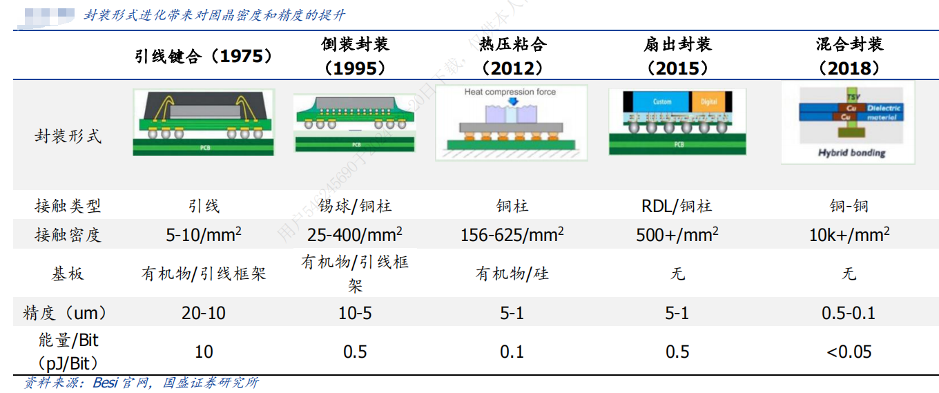 封裝技術(shù)經(jīng)歷了從最初通過(guò)引線框架到倒裝(FC)、熱壓粘合(TCP)、扇出封裝(Fan-out)、混合封裝(Hybrid Bonding)的演變,技術(shù)發(fā)展方向就是更多的 I/O、更薄的厚度,以承載更多復(fù)雜的芯片功能和適應(yīng)更輕薄的移動(dòng)設(shè)備。在此過(guò)程中,固晶的密度從 5-10/mm2提升到 10k+/mm2,精度從20-10um提升至0.5-0.1um,與此同時(shí),能量/Bit則進(jìn)一步縮小至0.05pJ/Bit,對(duì)固晶機(jī)的控制精度和工作效率都提出了更高的要求。
