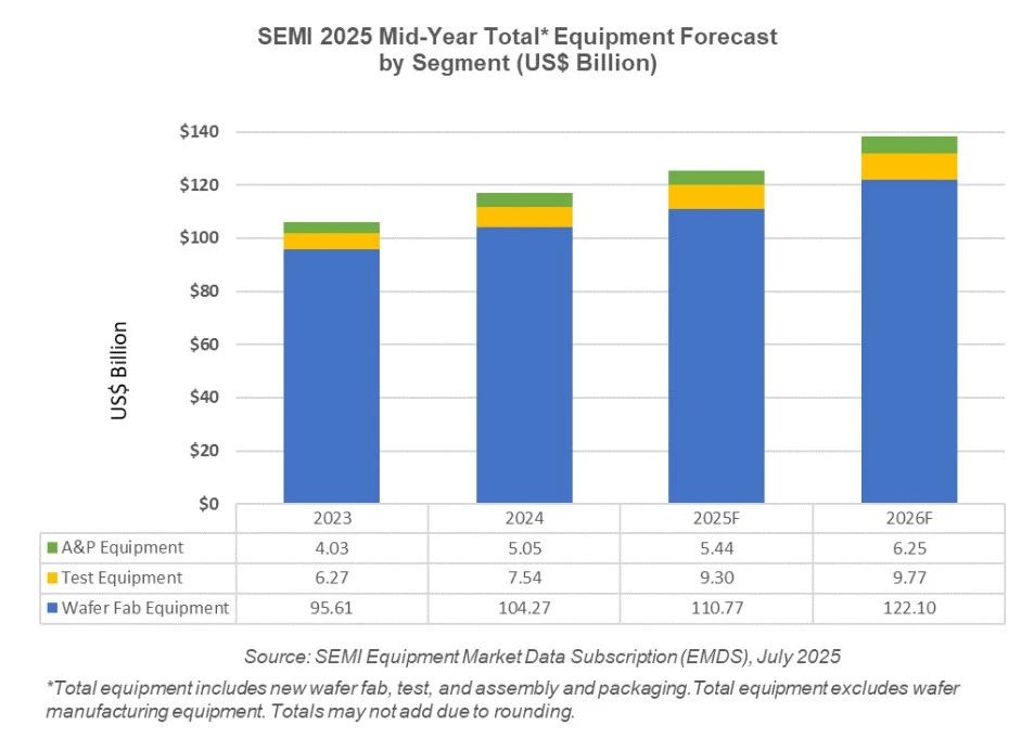美國加州時(shí)間2025年7月22日,SEMI在《年中總半導(dǎo)體設(shè)備預(yù)測報(bào)告》(Mid-Year Total Semiconductor Equipment Forecast – OEM Perspective)中指出,2025年全球原始設(shè)備制造商(OEM)的半導(dǎo)體制造設(shè)備總銷售額預(yù)計(jì)將創(chuàng)下1255億美元的新紀(jì)錄,同比增長7.4%。在先進(jìn)邏輯、存儲器及技術(shù)遷移的持續(xù)推動(dòng)下,2026年設(shè)備銷售額有望進(jìn)一步攀升至1381億美元,實(shí)現(xiàn)連續(xù)三年增長。