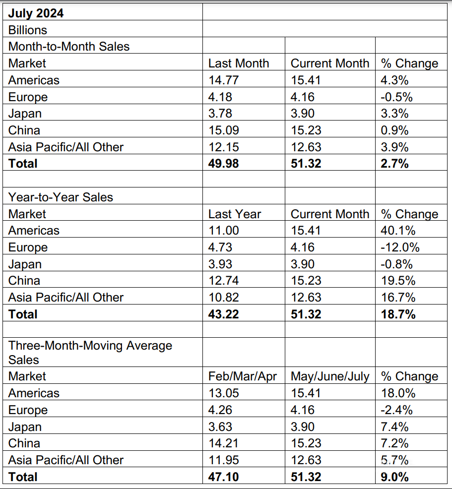 按地區(qū)劃分,7月美洲(40.1%)、中國(19.5%)和亞太/所有其他地區(qū)(16.7%)的銷售額均實現(xiàn)增長,但日本(-0.8%)和歐洲(-12.0%)的銷售額有所下降。