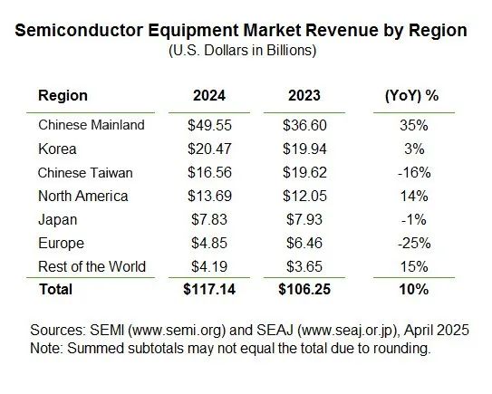 從區(qū)域來看,中國大陸、韓國和中國臺灣仍然是半導(dǎo)體設(shè)備支出的前三大市場,合計(jì)占全球市場的74%。中國大陸鞏固了其作為最大半導(dǎo)體設(shè)備市場的地位,投資同比增長35%,達(dá)到496億美元,這主要得益于積極的產(chǎn)能擴(kuò)張和政府支持相關(guān)舉措。韓國作為第二大市場,設(shè)備支出增長了3%,達(dá)到205億美元,這是因?yàn)榇鎯ζ魇袌鲒呌诜€(wěn)定,以及對高帶寬存儲器的需求激增。相比之下,中國臺灣的設(shè)備銷售額下降了16%,降至166億美元,這反映了對新產(chǎn)能需求的放緩。