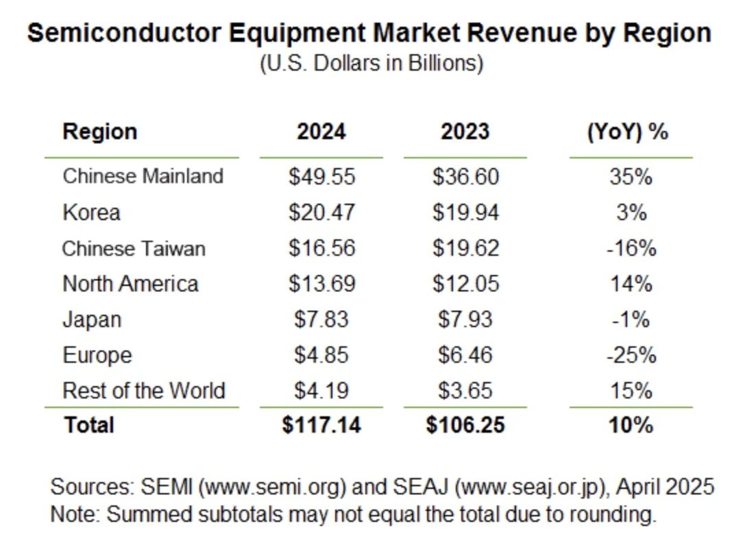 從報告來看,中國大陸無疑是2024年全球最大的半導(dǎo)體設(shè)備市場,韓國和中國臺灣隨后占據(jù)了前二、三的席位。