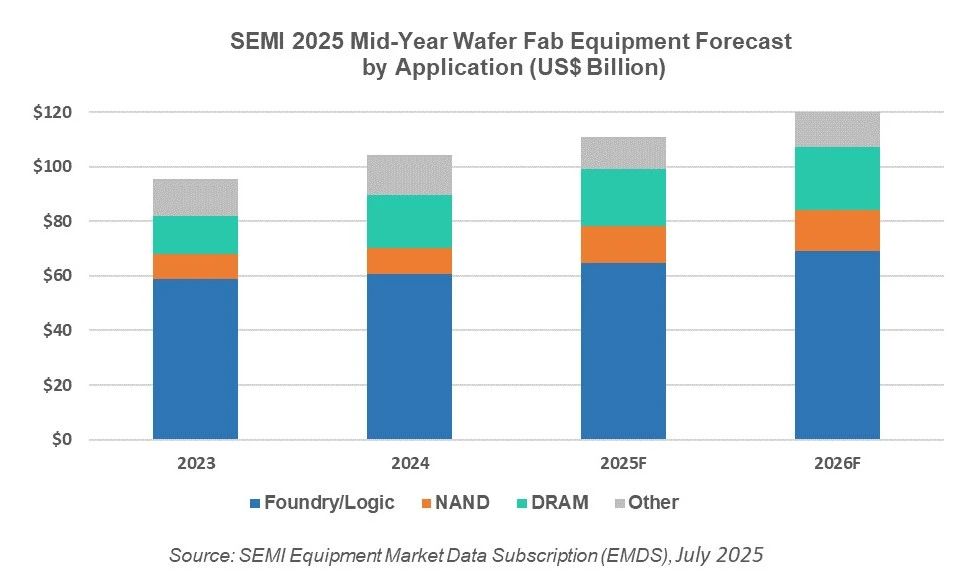 2025年,主要受先進節(jié)點強勁需求推動,用于Foundry和Logic應用的WFE銷售額預計將同比增長6.7%,達到648億美元。2026年,該細分市場預計將進一步增長6.6%,達到690億美元,增長動力來自產能擴張采購增加,以及隨著行業(yè)向2nm環(huán)繞式柵極(GAA)節(jié)點大規(guī)模生產邁進,對前沿技術的需求持續(xù)上升。