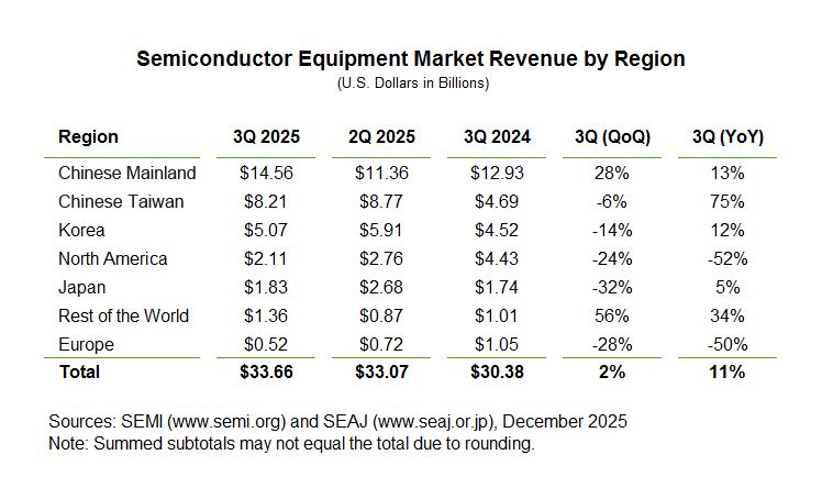 美國加州時間2025年12月2日,SEMI在《全球半導體設備市場報告》Worldwide Semiconductor Equipment Market Statistics (WWSEMS) Report中宣布,2025年第三季度全球半導體設備出貨金額同比增長11%,達到336.6億美元,環(huán)比增長2%。