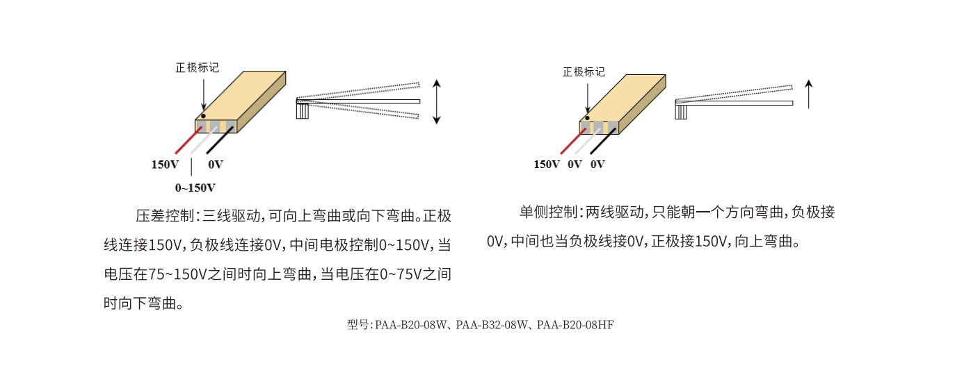 壓電雙晶片由壓電陶瓷層和內(nèi)電極共燒而成,可獨(dú)立控制每層壓電陶瓷的驅(qū)動(dòng)電壓。標(biāo)準(zhǔn)的驅(qū)動(dòng)電壓有0~24V和0~150V,并且滿足低頻、中頻和高頻應(yīng)用。